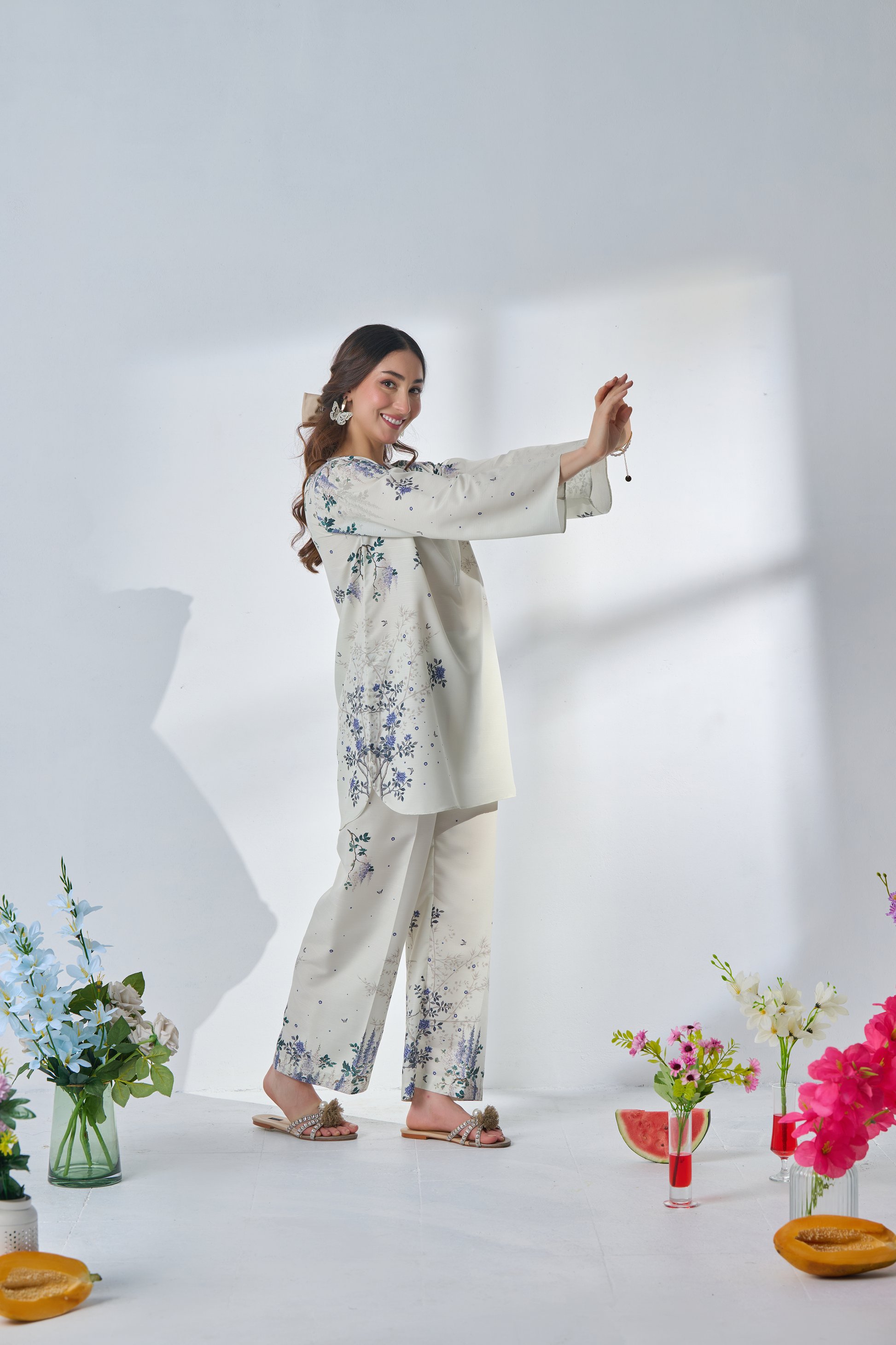 Crafted From Soft, Breathable Rayon, This White Cord Set Features Delicate Lavender Vine Pattern Prints That Add A Touch Of Sophistication To Your Look, The Relaxed Fit Ensures All-Day Ease.