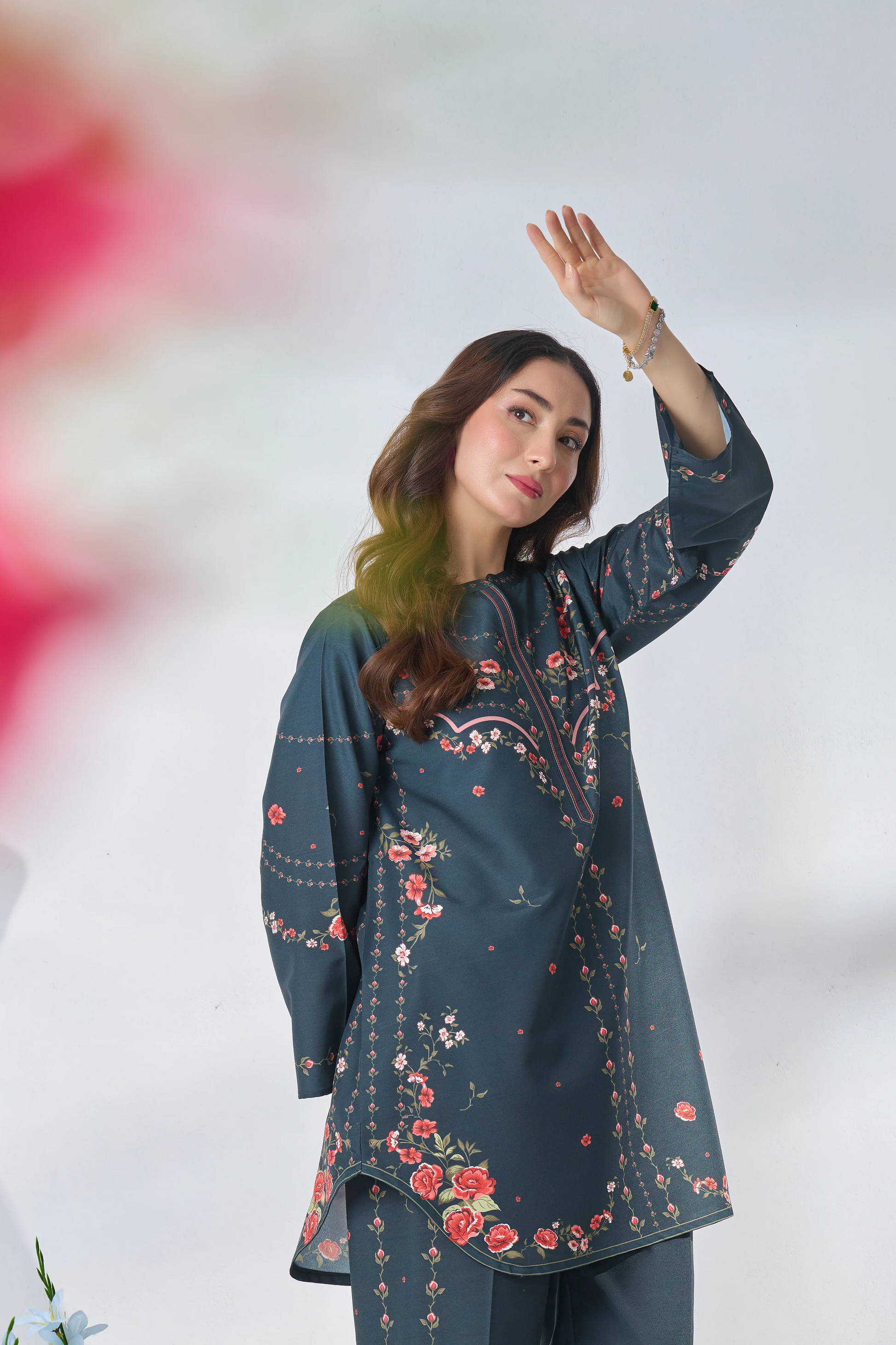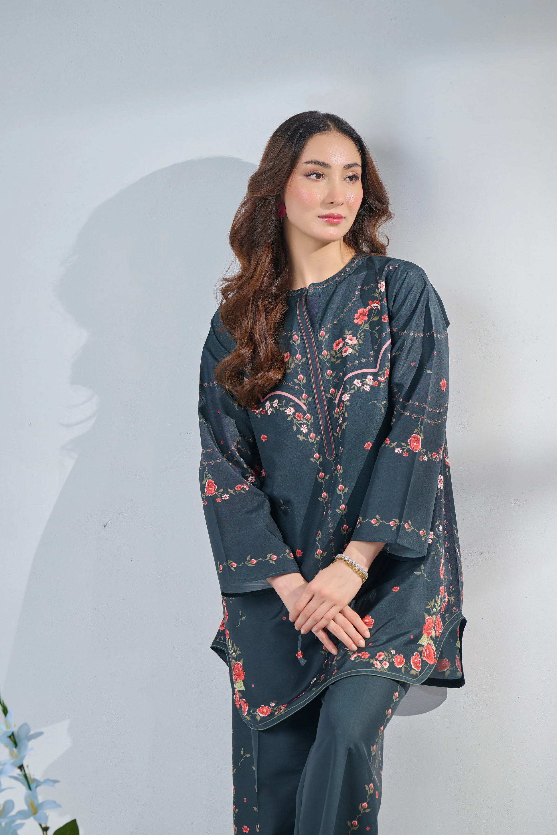 Elegant Dark Teal Cord Set Featuring Intricate Floral Prints, Straight Pants, And A Relaxed Fit Kurta With Flowy Sleeves – Perfect For A Chic Yet Comfortable Look Also Making It Perfect For Both Casual Outings And Party Wear